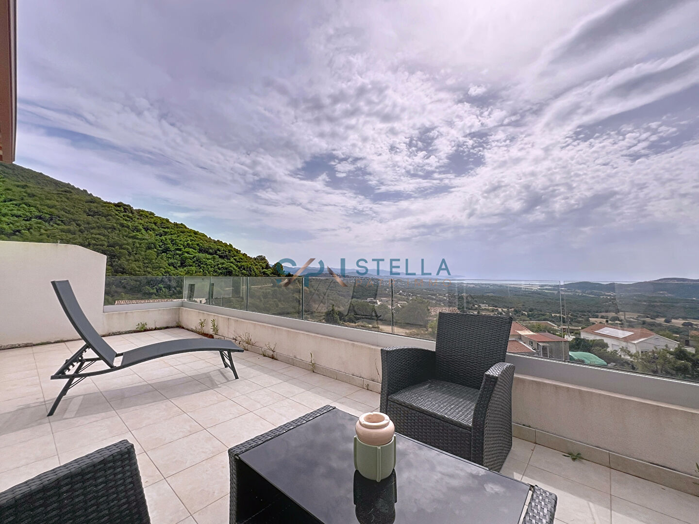 Et une grande terrasse offrant une vue dégagée et dominante sur la mer et la vallée