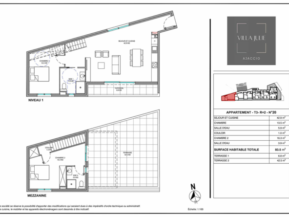 Cet appartement se compose au rez-de-chaussée d’une belle pièce de vie de 43 m2 avec coin cuisine, d’une chambre avec placard de 13.50 m2 et d’une salle d’eau avec WC de 5.90 m2. Depuis le séjour, vous aurez accès à une première terrasse de près de 7 m2. A l’étage, se trouve une chambre de plus de 16 m2, disposant de sa salle d’eau et WC, et d’un accès à une deuxième grande terrasse de 42.50 m2. Chaque pièce et annexe extérieur jouira d’une belle exposition Sud.