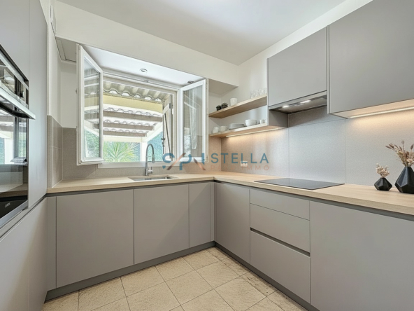 Une cuisine avec coin repas, donnant sur une superbe terrasse couverte d’environ 30 m² exposée Est, idéale pour les repas d’été à l’abri du soleil.