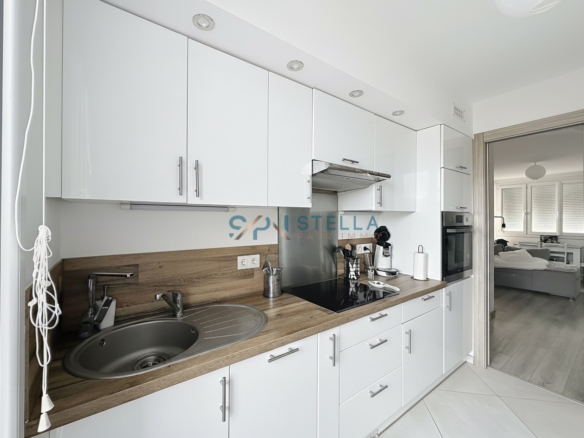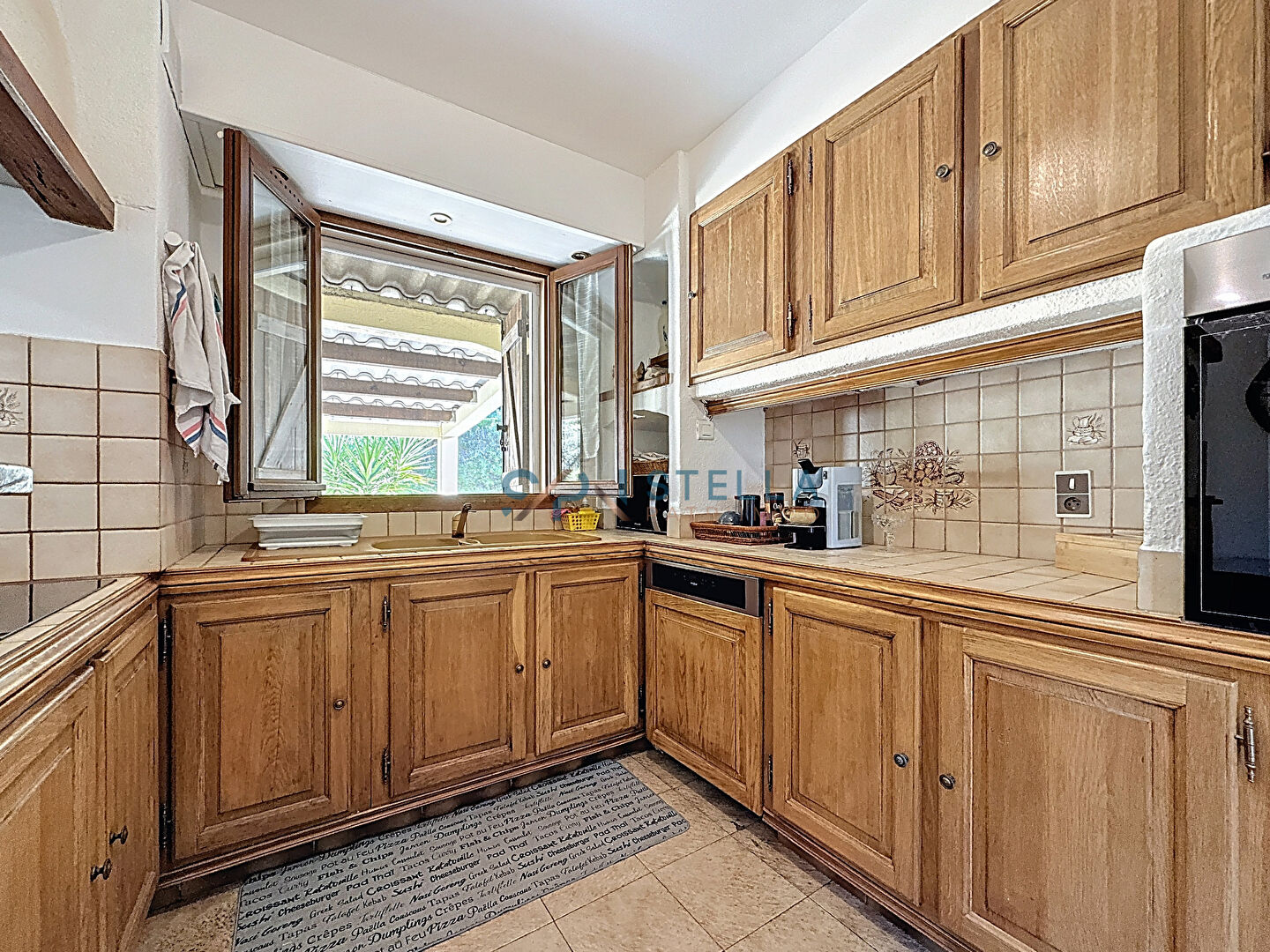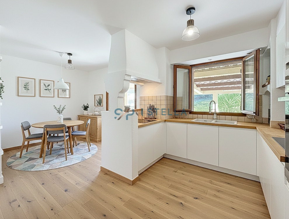 Une cuisine avec coin repas, donnant sur une superbe terrasse couverte d’environ 30 m² exposée Est, idéale pour les repas d’été à l’abri du soleil.