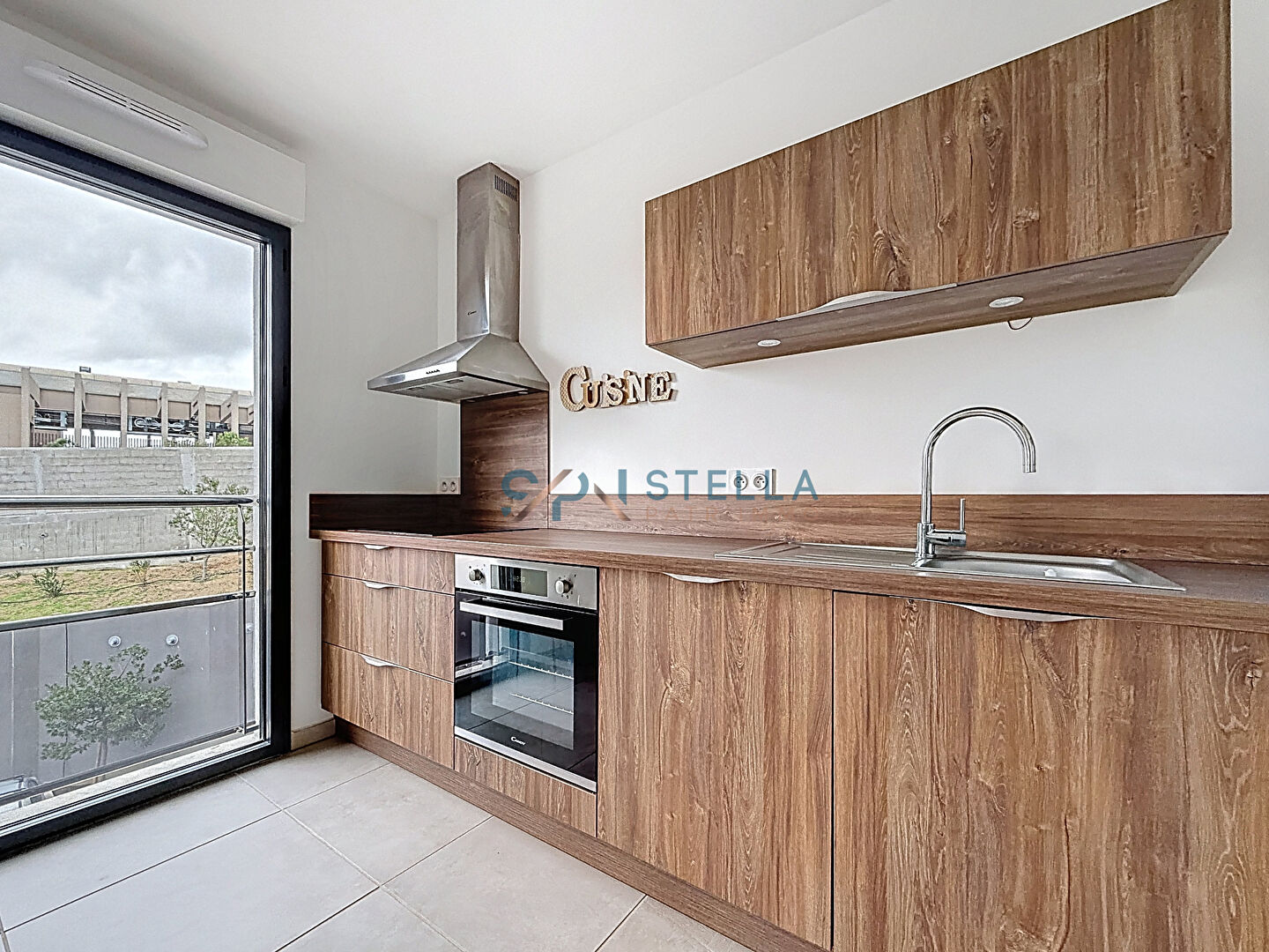 L’appartement se compose d’un séjour lumineux avec cuisine, bénéficiant de trois grandes ouvertures offrant une excellente luminosité naturelle et donnant accès à une terrasse de 4 m².