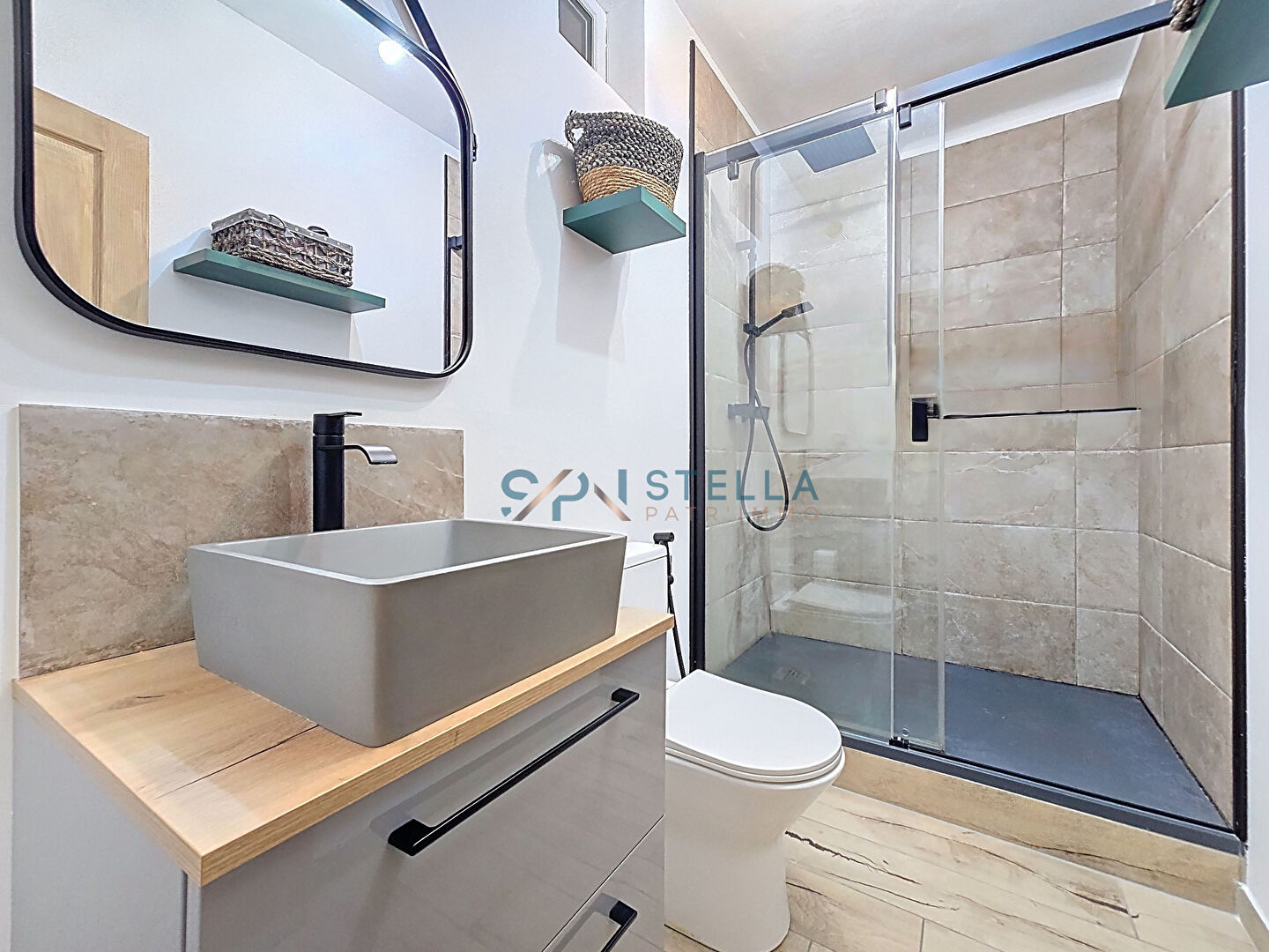 La salle d’eau, contemporaine et élégante, est équipée d’une grande douche à l’italienne.