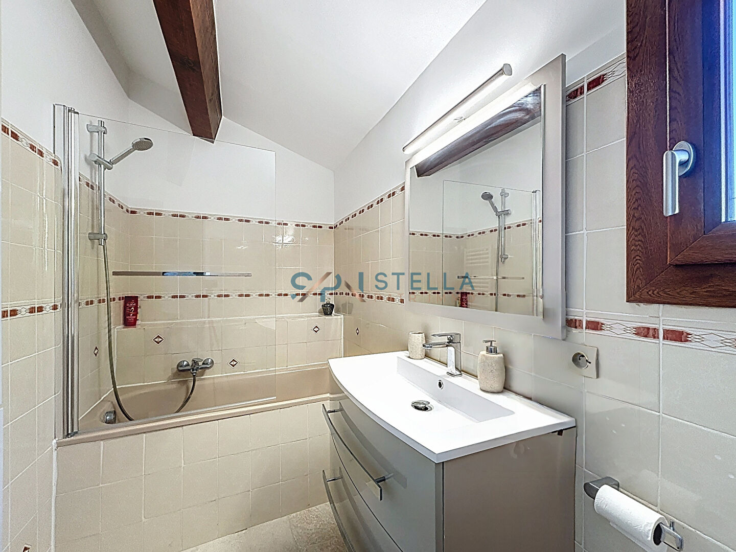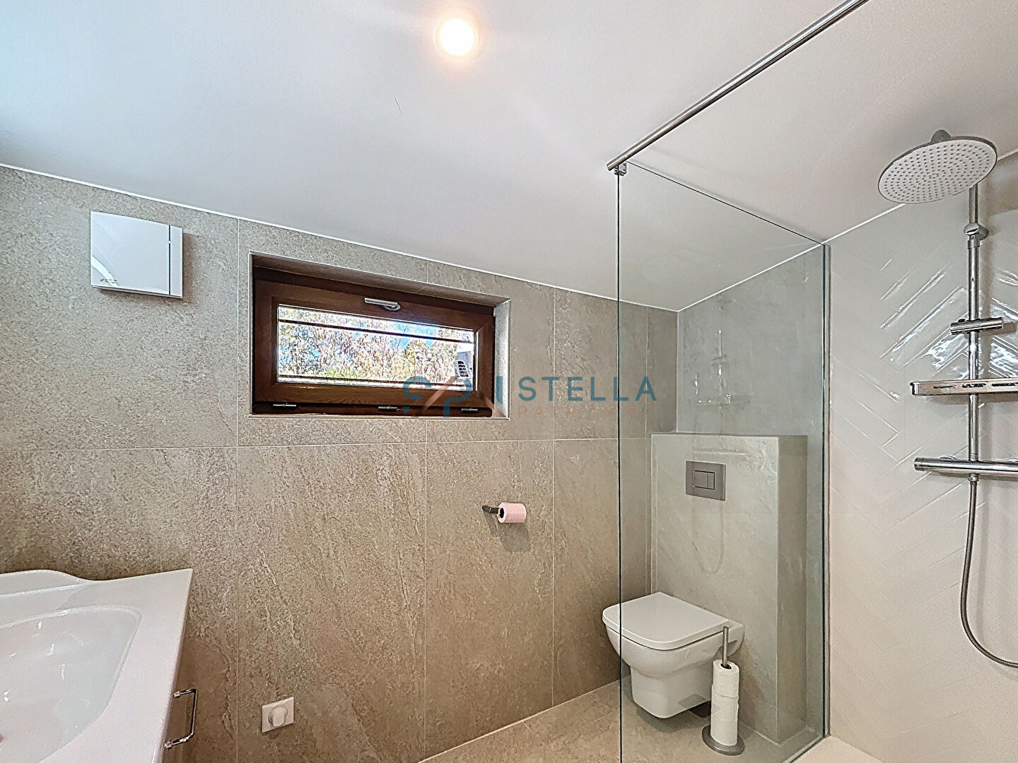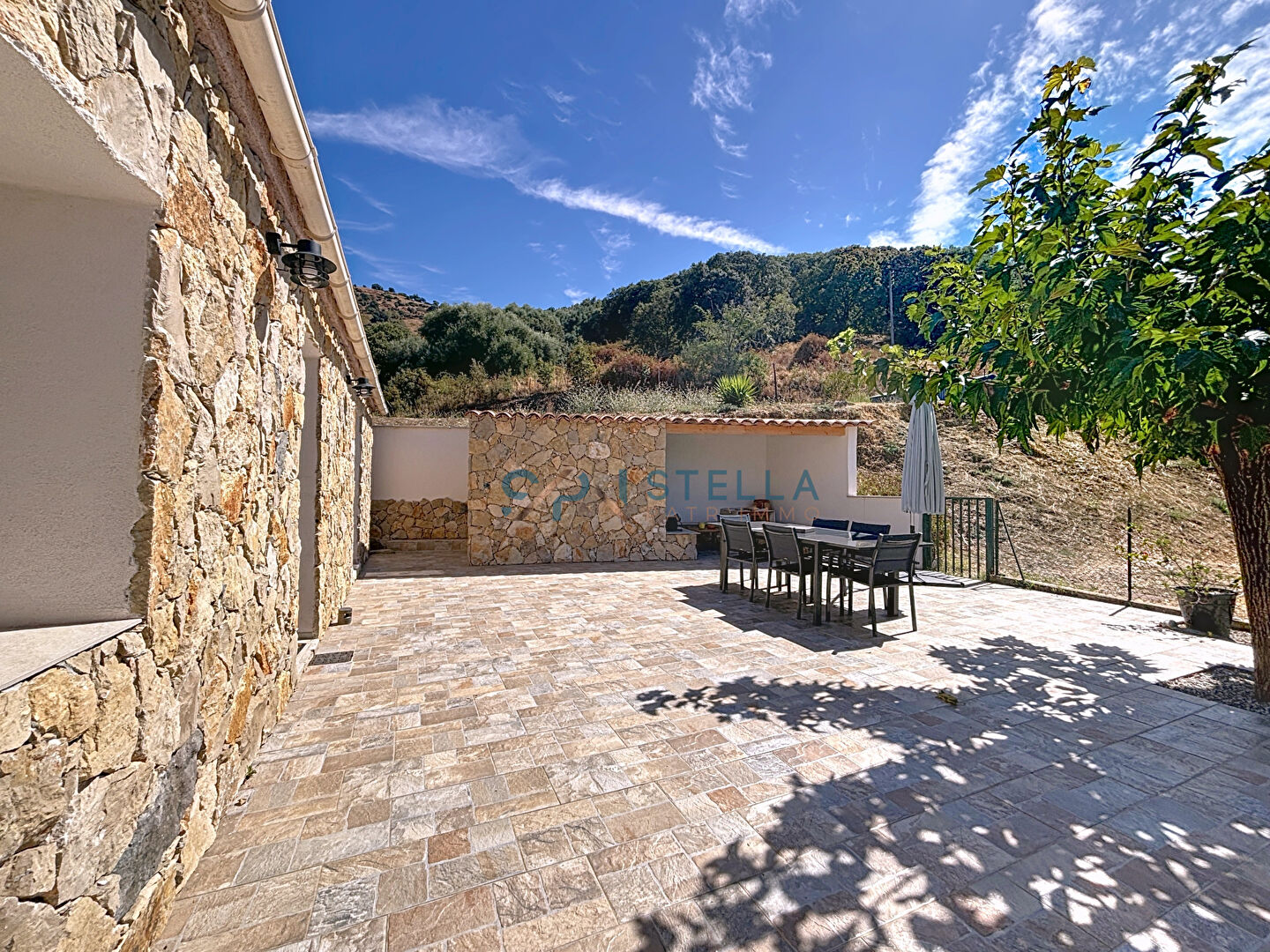 Depuis cette pièce ainsi que depuis le séjour, vous accéderez à une superbe terrasse entièrement rénovée avec un magnifique habillage en pierre. Un espace abrité permet de profiter de moments privilégiés en extérieur.