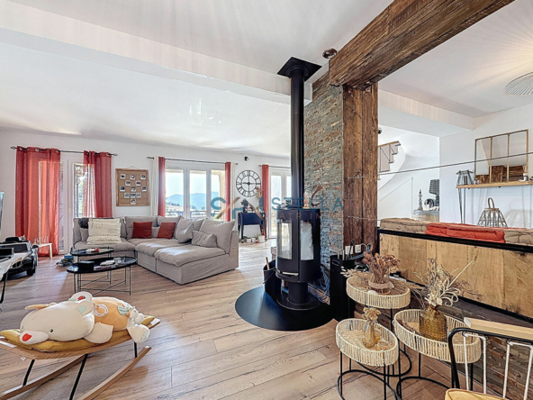 Au rez-de-chaussée, vous découvrirez une vaste pièce de vie lumineuse, regroupant le séjour et la salle à manger, réchauffée par un poêle à bois moderne. Cet espace s’ouvre sur une agréable terrasse couverte, offrant un splendide panorama sur les montagnes environnantes. La cuisine, spacieuse et conviviale, complète parfaitement ce niveau.