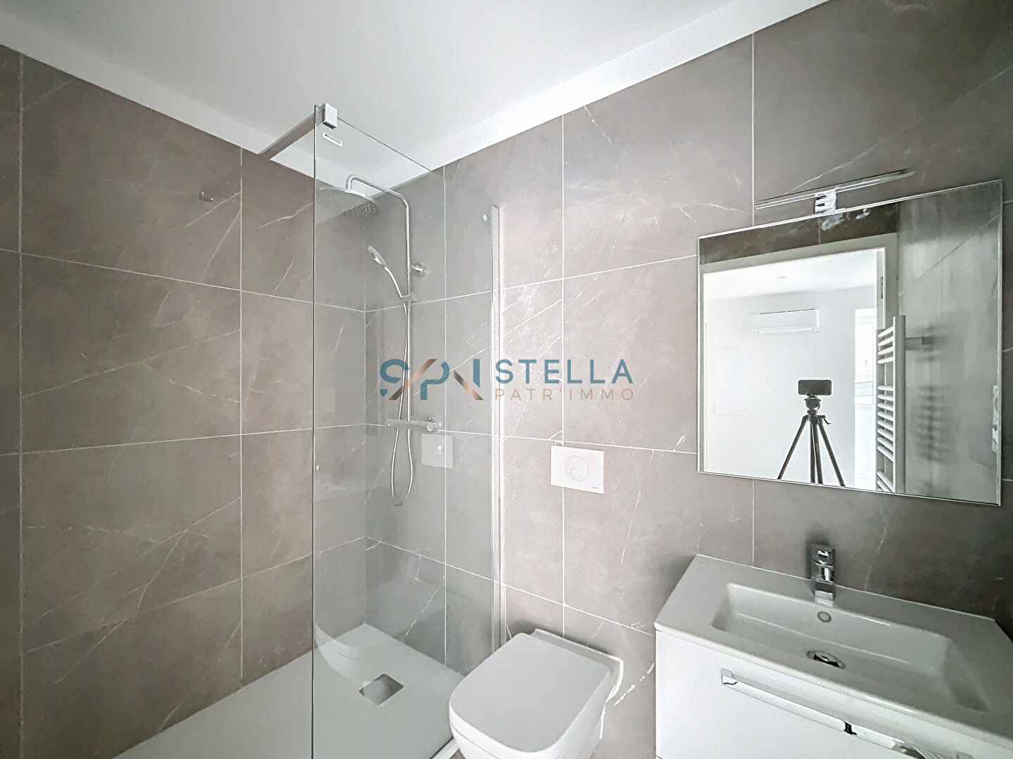 Salle d'eau moderneUne pièce d'eau rénovée avec goût offrant des prestations contemporaines et soignées.