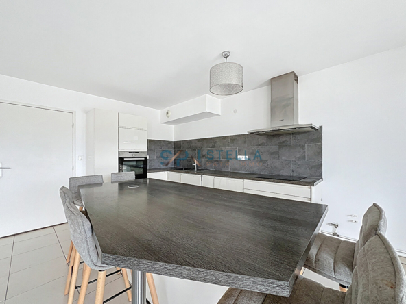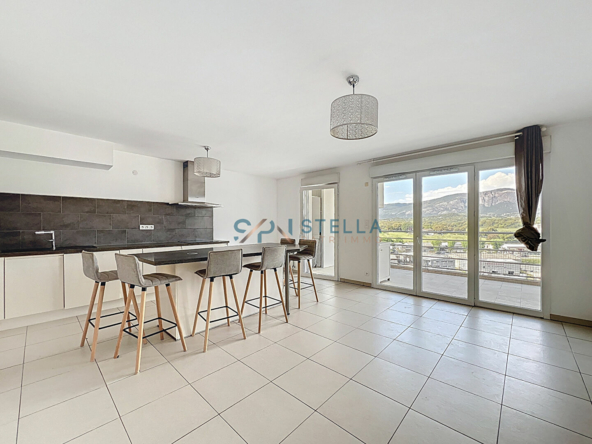 La pièce de vie, lumineuse, comprend un séjour avec cuisine ouverte donnant sur une terrasse de 14 m² bénéficiant d’une vue dégagée.
